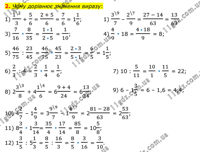 Чому дорівнює значення виразу: 1) 1^(\2)/3 + 5/6 = (2 + 5)/6 = 7/6 = 11/6; 3) 7/16 ∙ 8/35 = (1 • 1)/(2 • 5) = 1/10; 1) 3^(\9)/7 – 2^(\7)/9 = (27 - 14)/63 = 13/63; 4) 4/9 ∙ 18 = (4 • 18)/9 = 8; 5) 46/75 : 23/45 = 46/75 ∙ 45/23 = (2 • 3)/(5 • 1) = 6/5 = 11/5; 6) 2/3 : 4 = 2/3 ∙ 1/4 = 1/6; 7) 10 : 5/11 = 10/1 ∙ 11/5 = 22; 8) 23^(\3)/8 + 41^(\4)/6 = 6(9 + 4)/24 = 613/24; 9) 6 – 13/5 = 6 – 1,6 = 4,4; 10) 42/7 – 14/9 = 39^(\9)/7 – 14^(\7)/9 = 2(81 - 28)/63 = 253/63; 11) 83/4 ∙ 13/14= 35/4 ∙ 17/14 = 85/8 = 105/8; 12) 13/5 : 51/3 = 8/5 : 16/3 = 8/5 ∙ 3/16 = 3/10.