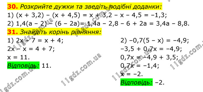 30. Розкрийте дужки та зведіть подібні доданки: 1) (х + 3,2) – (х + 4,5) = х + 3,2 – х – 4,5 = –1,3; 2) 1,4(а – 2) – (6 – 2а)= 1,4а – 2,8 – 6 + 2a = 3,4а – 8,8. 31. Знайдіть корінь рівняння: 1) 2х – 7 = х + 4; 2х – х = 4 + 7; х = 11. Відповідь: 11. 2) –0,7(5 – х) = –4,9; –3,5 + 0,7х = –4,9; 0,7х = –4,9 + 3,5; 0,7х = –1,4; х = –2. Відповідь: –2.
