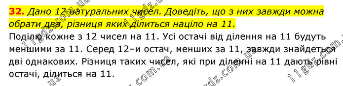 Дано 12 натуральних чисел. Доведіть, що з них завжди можна обрати два, різниця яких ділиться націло на 11. Поділю кожне з 12 чисел на 11. Усі остачі від ділення на 11 будуть меншими за 11. Серед 12–и остач, менших за 11, завжди знайдеться дві однакових. Різниця таких чисел, які при діленні на 11 дають рівні остачі, ділиться на 11.