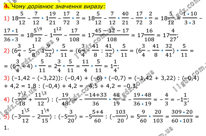 Чому дорівнює значення виразу: 1) 185/12 – 7/12 ∙ 119/21 – 17/72 ∙ 2/3 = 185/12 – 7/12 ∙ 40/21 – 17/72 ∙ 2/3 = 185/12 = (1 • 10)/(3 • 3) – (17 • 1)/(36 • 3) = 185^(\9)/12 – 11^12/9 – 17/108 = 17(45 - 12 - 17)/108 = 1716/108 = 174/27; 2) (63/4 – 51/8 : 19/32) ∙ 5/11 = (63/4 – 41/8 : 41/32) ∙ 5/11 = (63/4 – 41/8 ∙ 32/41) ∙ 5/11 = = (63/4 – 4) ∙ 5/11 = 23/4 ∙ 5/11 = 11/4 ∙ 5/11 = 11/4; 3) (–1,42 – (–3,22)): (–0,4) + (–6) ∙ (–0,7) = (–1,42 + 3,22) : (–0,4) + 4,2 = 1,8 : (–0,4) + 4,2 = –4,5 + 4,2 = –0,3; 4) (–7^(\2)/18 + 11^(\3)/12) : (–19/48) = – (-14+33)/36 ∙ 48/19 = – (19 • 48)/(36 • 19) = – 4/3 = –11/3; 5) (–31^(\5)/12 – 21^(\4)/15) : (–53/20) = –5(5+4)/60 : (–103/20) = 59/60 ∙ 20/103 = (309 • 20)/(60 • 103) = 1.