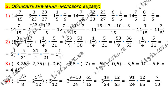 Обчисліть значення числового виразу: 1) 147/15 – 33/23 ∙ 23/27 – 11/5 ∙ 1/6 = 147/15 – 72/23 ∙ 23/27 – 6/5 ∙ 1/6 = 147/5 – 8/3 – 1/5 = = 147/15 – 22^(\5)/3 – 1^(\3)/5 = 12(7 - 10 - 3)/15 = 11(15 + 7 - 10 - 3)/15 = 119/15 = 113/5; 2) (58/9 : 117/36 + 11/4) ∙ 5/21 = (53/9 : 53/36 + 11/4) ∙ 5/21 = (53/9 ∙ 36/53 + 11/4) ∙ 5/21 = = 51/4 ∙ 5/21 = 21/4 ∙ 5/21 = 11/4; 3) (–3,25 – 2,75): (–0,6) + 0,8 ∙ (–7) = –6 : (–0,6) – 5,6 = 10 – 5,6 = = 4,4; 4) (–13^(\3)/8 – 25^(\2)/12) : 55/12 = –3(9+10)/24 : 65/12 = –319/24 ∙ 12/65 = –91/24 ∙ 12/65 = –7/10.