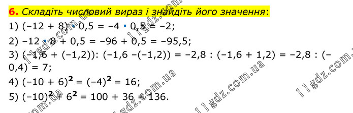 Складіть числовий вираз і знайдіть його значення: 1) (–12 + 8) ∙ 0,5 = –4 ∙ 0,5 = –2; 2) –12 ∙ 8 + 0,5 = –96 + 0,5 = –95,5; 3) (–1,6 + (–1,2)): (–1,6 –(–1,2)) = –2,8 : (–1,6 + 1,2) = –2,8 : (–0,4) = 7; 4) (–10 + 6)2 = (–4)2 = 16; 5) (–10)2 + 62 = 100 + 36 = 136.