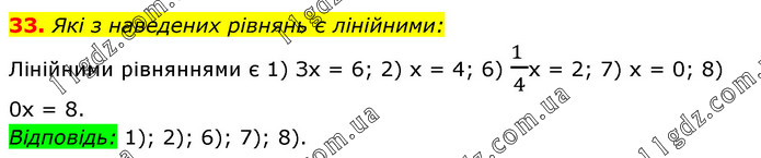 Які з наведених рівнянь є лінійними: Лінійними рівняннями є 1) Зх = 6; 2) х = 4; 6) (1 )/4х = 2; 7) х = 0; 8) 0х = 8. Відповідь: 1); 2); 6); 7); 8).