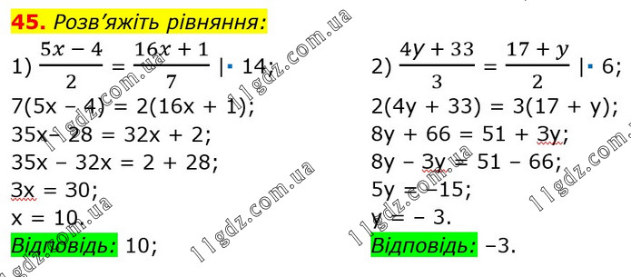 Розв’яжіть рівняння: 1) (5x - 4)/2 = (16x + 1)/7 |· 14; 7(5х – 4) = 2(16х + 1); 35х– 28 = 32х + 2; 35х – 32х = 2 + 28; Зх = З0; х = 10. Відповідь: 10; 2) (4у + 33)/3 = (17 + y)/2 |· 6; 2(4у + 33) = 3(17 + у); 8у + 66 = 51 + Зу; 8у – Зу = 51 – 66; 5у = –15; у = – 3. Відповідь: –3.