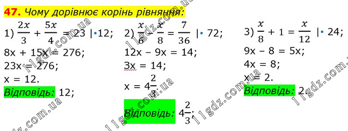 Чому дорівнює корінь рівняння: 1) 2x/3 + 5x/4 = 23 |·12; 8x + 15x = 276; 23х = 276; х = 12. Відповідь: 12; 2) x/6 – x/8 = 7/36 |∙ 72; 12x – 9x = 14; Зх = 14; x = 42/3. Відповідь: 42/3; 3) x/8 + 1 = x/12 |∙ 24; 9х – 8 = 5х; 4x = 8; x = 2. Відповідь: 2.