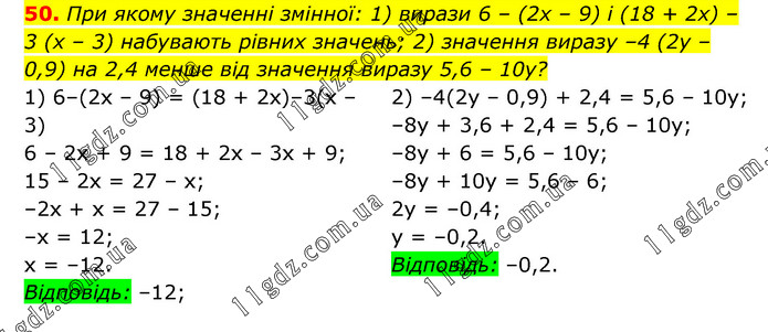 При якому значенні змінної: 1) вирази 6 – (2x – 9) і (18 + 2x) – 3 (x – 3) набувають рівних значень; 2) значення виразу –4 (2y – 0,9) на 2,4 менше від значення виразу 5,6 – 10y? 1) 6–(2x – 9) = (18 + 2x)–3(x – 3) 6 – 2x + 9 = 18 + 2x – 3x + 9; 15 – 2x = 27 – x; –2x + x = 27 – 15; –x = 12; x = –12. Відповідь: –12; 2) –4(2y – 0,9) + 2,4 = 5,6 – 10y; –8y + 3,6 + 2,4 = 5,6 – 10y; –8y + 6 = 5,6 – 10y; –8y + 10y = 5,6 – 6; 2y = –0,4; y = –0,2. Відповідь: –0,2.