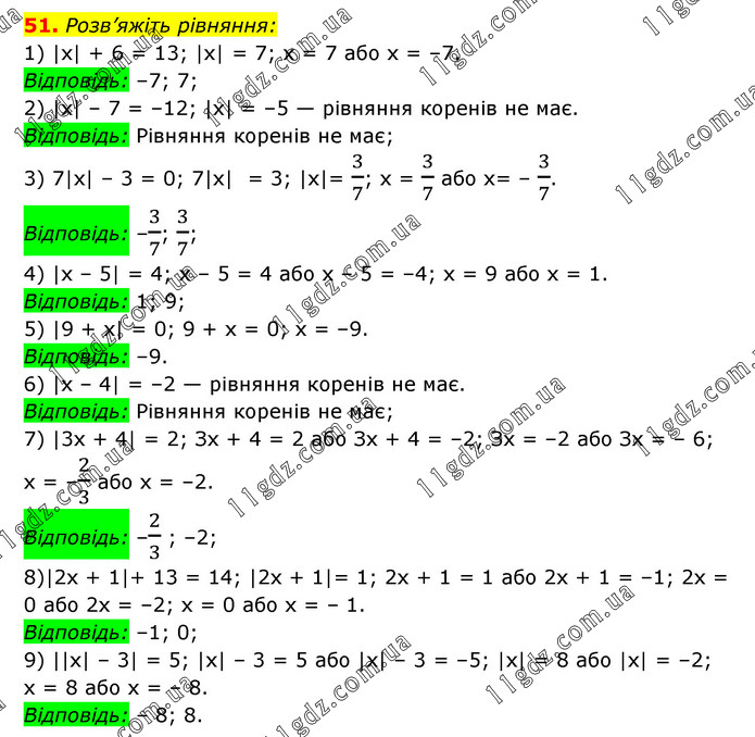 Розв’яжіть рівняння: 1) |х| + 6 = 13; |х| = 7; х = 7 або х = –7. Відповідь: –7; 7; 2) |х| – 7 = –12; |х| = –5 — рівняння коренів не має. Відповідь: Рівняння коренів не має; 3) 7|х| – 3 = 0; 7|х| = 3; |х|= 3/7; х = 3/7 або х= – 3/7. Відповідь: –3/7; 3/7; 4) |х – 5| = 4; х – 5 = 4 або x – 5 = –4; x = 9 або х = 1. Відповідь: 1; 9; 5) |9 + х| = 0; 9 + x = 0; x = –9. Відповідь: –9. 6) |х – 4| = –2 — рівняння коренів не має. Відповідь: Рівняння коренів не має; 7) |3х + 4| = 2; Зх + 4 = 2 або Зх + 4 = –2; Зх = –2 або Зх = – 6; х = –2/3 або х = –2. Відповідь: –2/3 ; –2; 8)|2х + 1|+ 13 = 14; |2х + 1|= 1; 2х + 1 = 1 або 2х + 1 = –1; 2х = 0 або 2х = –2; х = 0 або х = – 1. Відповідь: –1; 0; 9) ||х| – 3| = 5; |х| – 3 = 5 або |х| – 3 = –5; |х| = 8 або |х| = –2; х = 8 або х = – 8. Відповідь: – 8; 8.