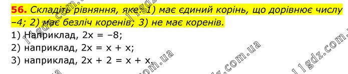 Складіть рівняння, яке: 1) має єдиний корінь, що дорівнює числу –4; 2) має безліч коренів; 3) не має коренів. 1) Наприклад, 2х = –8; 2) наприклад, 2х = х + x; 3) наприклад, 2х + 2 = х + х.