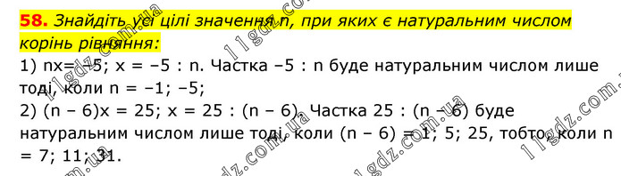 Знайдіть усі цілі значення n, при яких є натуральним числом корінь рівняння: 1) nх= –5; х = –5 : n. Частка –5 : n буде натуральним числом лише тоді, коли n = –1; –5; 2) (n – 6)х = 25; х = 25 : (n – 6). Частка 25 : (n – 6) буде натуральним числом лише тоді, коли (n – 6) = 1; 5; 25, тобто, коли n = 7; 11; 31.