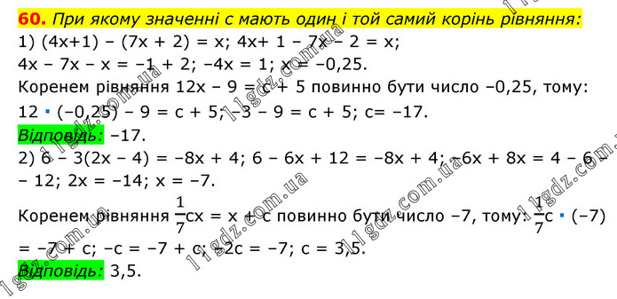 При якому значенні c мають один і той самий корінь рівняння: 1) (4х+1) – (7х + 2) = х; 4х+ 1 – 7х – 2 = х; 4х – 7х – х = –1 + 2; –4x = 1; х = –0,25. Коренем рівняння 12х – 9 = с + 5 повинно бути число –0,25, тому: 12 ∙ (–0,25) – 9 = с + 5; –3 – 9 = с + 5; с= –17. Відповідь: –17. 2) 6 – 3(2х – 4) = –8х + 4; 6 – 6x + 12 = –8х + 4; –6х + 8х = 4 – 6 – – 12; 2х = –14; х = –7. Коренем рівняння 1/7сх = х + с повинно бути число –7, тому: 1/7с ∙ (–7) = –7 + с; –с = –7 + с; –2с = –7; с = 3,5. Відповідь: 3,5.