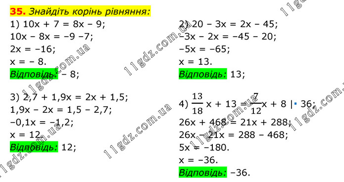Знайдіть корінь рівняння: 1) 10х + 7 = 8х – 9; 10х – 8х = –9 –7; 2х = –16; х = – 8. Відповідь: – 8; 2) 20 – Зх = 2х – 45; –Зх – 2х = –45 – 20; –5х = –65; х = 13. Відповідь: 13; 3) 2,7 + 1,9x = 2x + 1,5; 1,9x – 2х = 1,5 – 2,7; –0,1х = –1,2; х = 12. Відповідь: 12; 4) 13/18 х + 13 = 7/12х + 8 |∙ 36; 26х + 468 = 21х + 288; 26х – 21х = 288 – 468; 5х = –180. х = –36. Відповідь: –36.