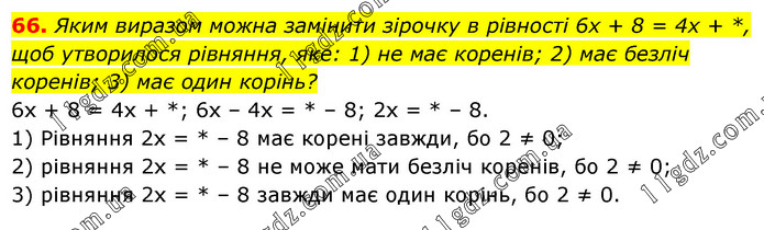 Яким виразом можна замінити зірочку в рівності 6x + 8 = 4x + *, щоб утворилося рівняння, яке: 1) не має коренів; 2) має безліч коренів; 3) має один корінь? 6х + 8 = 4х + *; 6х – 4х = * – 8; 2х = * – 8. 1) Рівняння 2х = * – 8 має корені завжди, бо 2 ≠ 0; 2) рівняння 2х = * – 8 не може мати безліч коренів, бо 2 ≠ 0; 3) рівняння 2х = * – 8 завжди має один корінь, бо 2 ≠ 0.