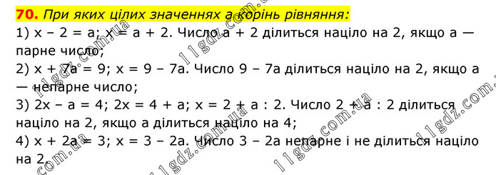 При яких цілих значеннях a корінь рівняння: 1) х – 2 = а; х = а + 2. Число а + 2 ділиться націло на 2, якщо а — парне число; 2) х + 7а = 9; х = 9 – 7а. Число 9 – 7а ділиться націло на 2, якщо а — непарне число; 3) 2х – а = 4; 2х = 4 + а; х = 2 + а : 2. Число 2 + а : 2 ділиться націло на 2, якщо а ділиться націло на 4; 4) х + 2а = 3; х = 3 – 2а. Число 3 – 2а непарне і не ділиться націло на 2.