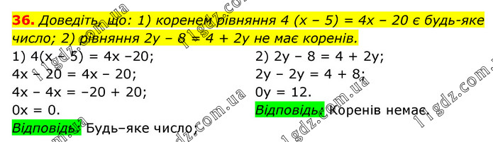 Доведіть, що: 1) коренем рівняння 4 (x – 5) = 4x – 20 є будь-яке число; 2) рівняння 2y – 8 = 4 + 2y не має коренів. 1) 4(х – 5) = 4х –20; 4х – 20 = 4х – 20; 4х – 4х = –20 + 20; 0х = 0. Відповідь: Будь–яке число; 2) 2y – 8 = 4 + 2у; 2у – 2у = 4 + 8; 0у = 12. Відповідь: Коренів немає.