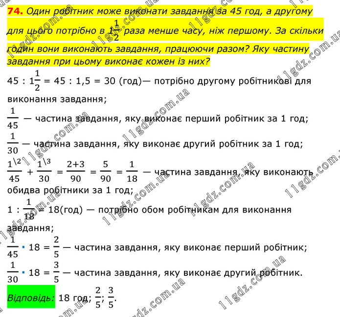 Один робітник може виконати завдання за 45 год, а другому для цього потрібно в 11/2 раза менше часу, ніж першому. За скільки годин вони виконають завдання, працюючи разом? Яку частину завдання при цьому виконає кожен із них? 45 : 11/2 = 45 : 1,5 = 30 (год)— потрібно другому робітникові для виконання завдання; 1/45 — частина завдання, яку виконає перший робітник за 1 год; 1/30 — частина завдання, яку виконає другий робітник за 1 год; 1^(\2)/45 + 1^(\3)/30 = (2+3)/90 = 5/90 = 1/18 — частина завдання, яку виконають обидва робітники за 1 год; 1 : 1/18 = 18(год) — потрібно обом робітникам для виконання завдання; 1/45 ∙ 18 = 2/5 — частина завдання, яку виконає перший робітник; 1/30 ∙ 18 = 3/5 — частина завдання, яку виконає другий робітник. Відповідь: 18 год; 2/5; 3/5.