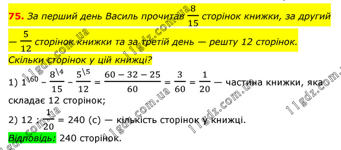 За перший день Василь прочитав 8/15 сторінок книжки, за другий — 5/12 сторінок книжки та за третій день — решту 12 сторінок. Скільки сторінок у цій книжці? 1) 1\60 – 8^(\4)/15 – 5^(\5)/12 = (60 - 32 - 25)/60 = 3/60 = 1/20 — частина книжки, яка складає 12 сторінок; 2) 12 : 1/20 = 240 (с) — кількість сторінок у книжці. Відповідь: 240 сторінок.