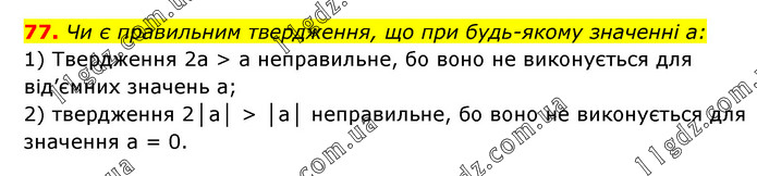 Чи є правильним твердження, що при будь-якому значенні a: 1) Твердження 2а > а неправильне, бо воно не виконується для від’ємних значень а; 2) твердження 2│а│ > │а│ неправильне, бо воно не виконується для значення а = 0.