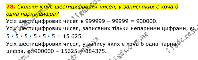 Скільки існує шестицифрових чисел, у записі яких є хоча б одна парна цифра? Усіх шестицифрових чисел є 999999 – 99999 = 900000. Усіх шестицифрових чисел, записаних тільки непарними цифрами, є: 5 ∙ 5 ∙ 5 ∙ 5 ∙ 5 ∙ 5 = 15 625. Усіх шестицифрових чисел, у запису яких є хоча б одна парна цифра, є: 900000 – 15625 = 884375.