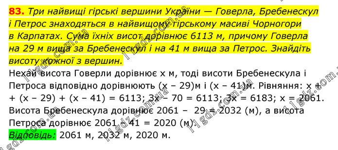 Три найвищі гірські вершини України — Говерла, Бребенескул і Петрос знаходяться в найвищому гірському масиві Чорногори в Карпатах. Сума їхніх висот дорівнює 6113 м, причому Говерла на 29 м вища за Бребенескул і на 41 м вища за Петрос. Знайдіть висоту кожної з вершин. Нехай висота Говерли дорівнює х м, тоді висоти Бребенескула і Петроса відповідно дорівнюють (х – 29)м і (х – 41)м. Рівняння: х + + (х – 29) + (х – 41) = 6113; Зх – 70 = 6113; 3х = 6183; х = 2061. Висота Бребенескула дорівнює 2061 – 29 = 2032 (м), а висота Петроса дорівнює 2061 – 41 = 2020 (м). Відповідь: 2061 м, 2032 м, 2020 м.