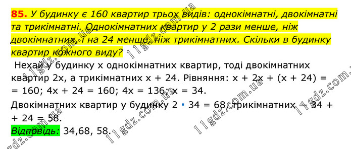 У будинку є 160 квартир трьох видів: однокімнатні, двокімнатні та трикімнатні. Однокімнатних квартир у 2 рази менше, ніж двокімнатних, і на 24 менше, ніж трикімнатних. Скільки в будинку квартир кожного виду? Нехай у будинку х однокімнатних квартир, тоді двокімнатних квартир 2х, а трикімнатних х + 24. Рівняння: х + 2х + (х + 24) = = 160; 4х + 24 = 160; 4х = 136; х = 34. Двокімнатних квартир у будинку 2 ∙ 34 = 68, трикімнатних — 34 + + 24 = 58. Відповідь: 34,68, 58.