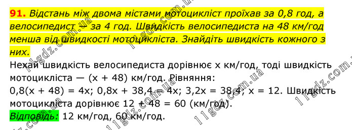 Відстань між двома містами мотоцикліст проїхав за 0,8 год, а велосипедист — за 4 год. Швидкість велосипедиста на 48 км/год менша від швидкості мотоцикліста. Знайдіть швидкість кожного з них. Нехай швидкість велосипедиста дорівнює х км/год, тоді швидкість мотоцикліста — (х + 48) км/год. Рівняння: 0,8(х + 48) = 4х; 0,8х + 38,4 = 4х; 3,2х = 38,4; х = 12. Швидкість мотоцикліста дорівнює 12 + 48 = 60 (км/год). Відповідь: 12 км/год, 60 км/год.