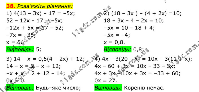 Розв’яжіть рівняння: 1) 4(13 – Зх) – 17 = –5x; 52 – 12x – 17 = –5x; –12x + 5x = 17 – 52; –7х = –35; x = 5. Відповідь: 5; 2) (18 – 3x ) – (4 + 2x) =10; 18 – 3x – 4 – 2x = 10; –5x = 10 – 18 + 4; –5x = –4; x = 0,8. Відповідь: 0,8; 3) 14 – x = 0,5(4 – 2x) + 12; 14 – х = 2 – x + 12; –х + х = 2 + 12 – 14; 0x = 0. Відповідь: Будь–яке число; 4) 4x – 3(20 – x) = 10x – 3(11 + x); 4x – 60 + 3x = 10x – 33 – Зх; 4x + 3x – 10x + 3x = –33 + 60; 0x = 27. Відповідь: Коренів немає.