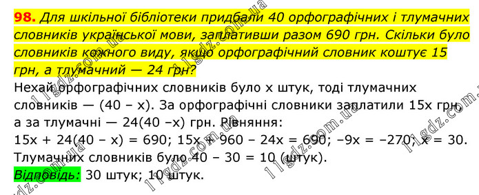 Для шкільної бібліотеки придбали 40 орфографічних і тлумачних словників української мови, заплативши разом 690 грн. Скільки було словників кожного виду, якщо орфографічний словник коштує 15 грн, а тлумачний — 24 грн? Нехай орфографічних словників було х штук, тоді тлумачних словників — (40 – х). За орфографічні словники заплатили 15х грн, а за тлумачні — 24(40 –х) грн. Рівняння: 15х + 24(40 – х) = 690; 15х + 960 – 24х = 690; –9х = –270; х = 30. Тлумачних словників було 40 – 30 = 10 (штук). Відповідь: 30 штук; 10 штук.