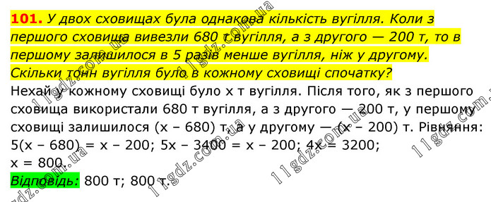 У двох сховищах була однакова кількість вугілля. Коли з першого сховища вивезли 680 т вугілля, а з другого — 200 т, то в першому залишилося в 5 разів менше вугілля, ніж у другому. Скільки тонн вугілля було в кожному сховищі спочатку? Нехай у кожному сховищі було х т вугілля. Після того, як з першого сховища використали 680 т вугілля, а з другого — 200 т, у першому сховищі залишилося (х – 680) т, а у другому — (х – 200) т. Рівняння: 5(х – 680) = х – 200; 5х – 3400 = х – 200; 4х = 3200; х = 800. Відповідь: 800 т; 800 т.