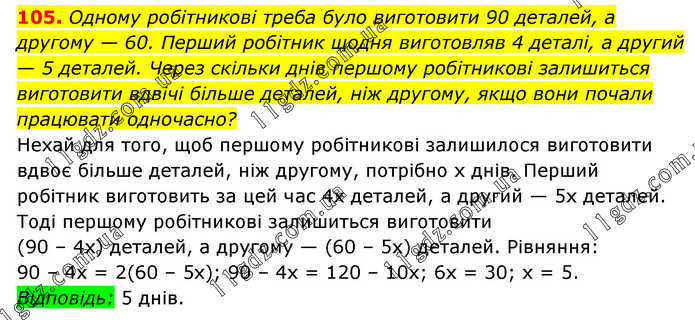 Одному робітникові треба було виготовити 90 деталей, а другому — 60. Перший робітник щодня виготовляв 4 деталі, а другий — 5 деталей. Через скільки днів першому робітникові залишиться виготовити вдвічі більше деталей, ніж другому, якщо вони почали працювати одночасно? Нехай для того, щоб першому робітникові залишилося виготовити вдвоє більше деталей, ніж другому, потрібно х днів. Перший робітник виготовить за цей час 4х деталей, а другий — 5х деталей. Тоді першому робітникові залишиться виготовити (90 – 4х) деталей, а другому — (60 – 5х) деталей. Рівняння: 90 – 4х = 2(60 – 5х); 90 – 4х = 120 – 10х; 6х = 30; х = 5. Відповідь: 5 днів.