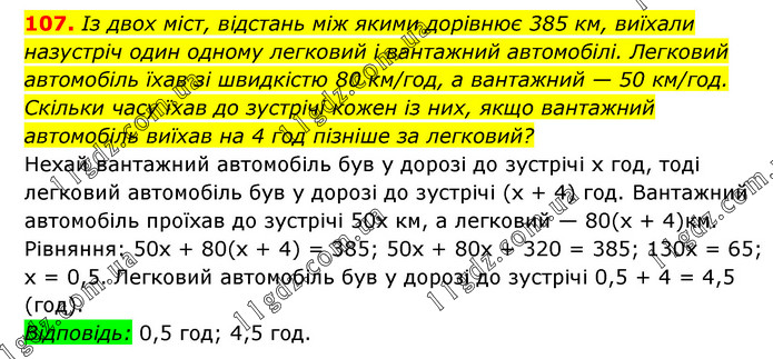 Із двох міст, відстань між якими дорівнює 385 км, виїхали назустріч один одному легковий і вантажний автомобілі. Легковий автомобіль їхав зі швидкістю 80 км/год, а вантажний — 50 км/год. Скільки часу їхав до зустрічі кожен із них, якщо вантажний автомобіль виїхав на 4 год пізніше за легковий? Нехай вантажний автомобіль був у дорозі до зустрічі х год, тоді легковий автомобіль був у дорозі до зустрічі (х + 4) год. Вантажний автомобіль проїхав до зустрічі 50х км, а легковий — 80(х + 4)км. Рівняння: 50х + 80(х + 4) = 385; 50х + 80х + 320 = 385; 130х = 65; х = 0,5. Легковий автомобіль був у дорозі до зустрічі 0,5 + 4 = 4,5 (год). Відповідь: 0,5 год; 4,5 год.