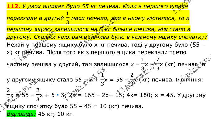 У двох ящиках було 55 кг печива. Коли з першого ящика переклали в другий 1/3 маси печива, яке в ньому містилося, то в першому ящику залишилося на 5 кг більше печива, ніж стало в другому. Скільки кілограмів печива було в кожному ящику спочатку? Нехай у першому ящику було х кг печива, тоді у другому було (55 – х) кг печива. Після того як з першого ящика переклали третю частину печива у другий, там залишилося х – 1/3х = 2/3х (кг) печива, а у другому ящику стало 55 – х + 1/3х = 55 – 2/3х (кг) печива. Рівняння: 2/3х = 55 – 2/3х + 5 ∙ 3; 2х = 165 – 2х+ 15; 4х= 180; х = 45. У другому ящику спочатку було 55 – 45 = 10 (кг) печива. Відповідь: 45 кг; 10 кг.