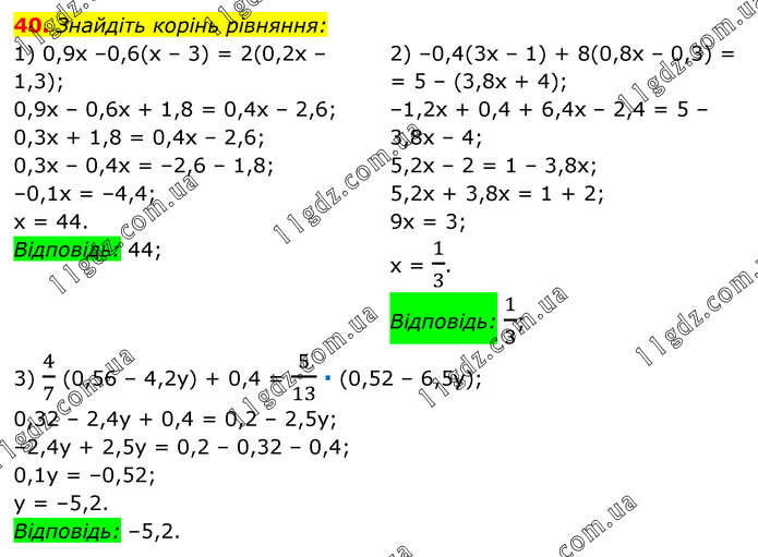 Знайдіть корінь рівняння: 1) 0,9x –0,6(x – 3) = 2(0,2x –1,3); 0,9x – 0,6x + 1,8 = 0,4x – 2,6; 0,3x + 1,8 = 0,4x – 2,6; 0,3x – 0,4x = –2,6 – 1,8; –0,1x = –4,4; x = 44. Відповідь: 44; 2) –0,4(3x – 1) + 8(0,8x – 0,3) = = 5 – (3,8x + 4); –1,2x + 0,4 + 6,4x – 2,4 = 5 – 3,8x – 4; 5,2x – 2 = 1 – 3,8x; 5,2x + 3,8x = 1 + 2; 9x = 3; x = 1/3. Відповідь: 1/3; 3) 4/7 (0,56 – 4,2y) + 0,4 = 5/13 ∙ (0,52 – 6,5y); 0,32 – 2,4y + 0,4 = 0,2 – 2,5y; –2,4y + 2,5y = 0,2 – 0,32 – 0,4; 0,1y = –0,52; y = –5,2. Відповідь: –5,2.