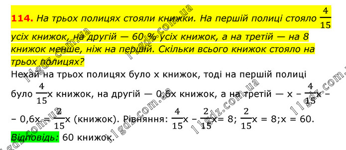 На трьох полицях стояли книжки. На першій полиці стояло 4/15 усіх книжок, на другій — 60 % усіх книжок, а на третій — на 8 книжок менше, ніж на першій. Скільки всього книжок стояло на трьох полицях? Нехай на трьох полицях було х книжок, тоді на першій полиці було 4/15х книжок, на другій — 0,6х книжок, а на третій — х – 4/15х – – 0,6х = 2/15х (книжок). Рівняння: 4/15x – 2/15х= 8; 2/15х = 8;х = 60. Відповідь: 60 книжок.