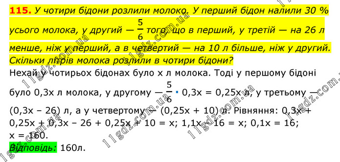 У чотири бідони розлили молоко. У перший бідон налили 30 % усього молока, у другий — 5/6 того, що в перший, у третій — на 26 л менше, ніж у перший, а в четвертий — на 10 л більше, ніж у другий. Скільки літрів молока розлили в чотири бідони? Нехай у чотирьох бідонах було х л молока. Тоді у першому бідоні було 0,3х л молока, у другому — 5/6 ∙ 0,3х = 0,25х л, у третьому — (0,3х – 26) л, а у четвертому — (0,25х + 10) л. Рівняння: 0,3х + 0,25х + 0,3х – 26 + 0,25х + 10 = х; 1,1х – 16 = х; 0,1х = 16; х = 160. Відповідь: 160 л.