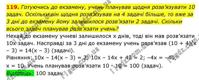 Готуючись до екзамену, учень планував щодня розв’язувати 10 задач. Оскільки він щодня розв’язував на 4 задачі більше, то вже за 3 дні до екзамену йому залишилося розв’язати 2 задачі. Скільки всього задач планував розв’язати учень? Нехай до екзамену учневі залишилося х днів, тоді він мав розв’язати 10х задач. Насправді за 3 дні до екзамену учень розв’язав (10 + 4)(х – 3) = 14(х – 3) (задачі). Рівняння: 10х – 14(х – 3) = 2; 10х – 14х + 42 = 2; –4х = –40; х = 10. Учень планував розв’язати 10 ∙ 10 = 100 (задач). Відповідь: 100 задач.