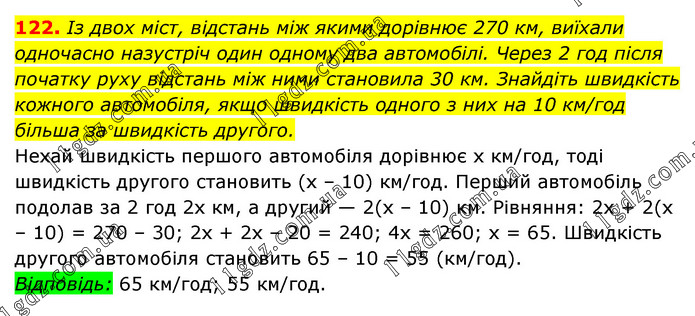 Із двох міст, відстань між якими дорівнює 270 км, виїхали одночасно назустріч один одному два автомобілі. Через 2 год після початку руху відстань між ними становила 30 км. Знайдіть швидкість кожного автомобіля, якщо швидкість одного з них на 10 км/год більша за швидкість другого. Нехай швидкість першого автомобіля дорівнює х км/год, тоді швидкість другого становить (х – 10) км/год. Перший автомобіль подолав за 2 год 2х км, а другий — 2(х – 10) км. Рівняння: 2х + 2(х – 10) = 270 – 30; 2х + 2х – 20 = 240; 4х = 260; х = 65. Швидкість другого автомобіля становить 65 – 10 = 55 (км/год). Відповідь: 65 км/год; 55 км/год.
