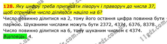 Яку цифру треба приписати ліворуч і праворуч до числа 37, щоб отримане число ділилося націло на 6? Число повинно ділитися на 2, тому його остання цифра повинна бути парною. Шуканими числами можуть бути 2372, 4374, 6376, 8378. Число повинно ділитися на 6, тому шуканим числом є 4374. Відповідь: 4.