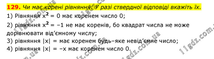 Чи має корені рівняння: У разі ствердної відповіді вкажіть їх. 1) Рівняння х2 = 0 має коренем число 0; 2) рівняння х2 = –1 не має коренів, бо квадрат числа не може дорівнювати від’ємному числу; 3) рівняння |х| = має коренем будь–яке невід’ємне число; 4) рівняння |х| = –х має коренем число 0.