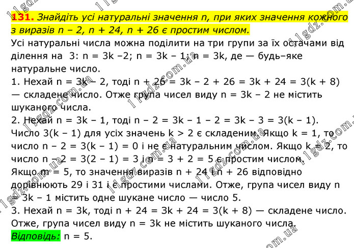 Знайдіть усі натуральні значення n, при яких значення кожного з виразів n – 2, n + 24, n + 26 є простим числом. Усі натуральні числа можна поділити на три групи за їх остачами від ділення на 3: n = 3k –2; n = 3k – 1; n = 3k, де — будь–яке натуральне число. 1. Нехай n = Зk – 2, тоді n + 26 = 3k – 2 + 26 = 3k + 24 = 3(k + 8) — складене число. Отже група чисел виду n = 3k – 2 не містить шуканого числа. 2. Нехай n = 3k – 1, тоді n – 2 = 3k – 1 – 2 = 3k – 3 = 3(k – 1). Число 3(k – 1) для усіх значень k > 2 є складеним. Якщо k = 1, то число n – 2 = 3(k – 1) = 0 і не є натуральним числом. Якщо k = 2, то число n – 2 = 3(2 – 1) = 3 і n = 3 + 2 = 5 є простим числом. Якщо m = 5, то значення виразів n + 24 і n + 26 відповідно дорівнюють 29 і 31 і є простими числами. Отже, група чисел виду n = 3k – 1 містить одне шукане число — число 5. 3. Нехай n = 3k, тоді n + 24 = Зk + 24 = 3(k + 8) — складене число. Отже, група чисел виду n = 3k не містить шуканого числа. Відповідь: n = 5.