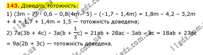 Доведіть тотожність: 1) (Зm – 7) ∙ 0,6 – 0,8(4m – 5) – (–1,7 – 1,4m) = 1,8m – 4,2 – 3,2m + 4 + 1,7 + 1,4m = 1,5 — тотожність доведена; 2) 7а(3b + 4с) – 3а(b + 1/3с) = 21аb + 28ас – 3аb – ас = 18аb + 27ас = 9а(2b + Зс) — тотожність доведена.