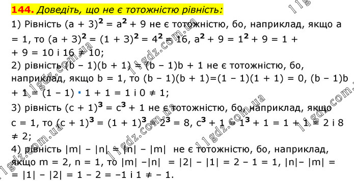 Доведіть, що не є тотожністю рівність: 1) Рівність (а + 3)2 = а2 + 9 не є тотожністю, бо, наприклад, якщо а = 1, то (а + З)2 = (1 + З)2 = 42 = 16, а2 + 9 = 12 + 9 = 1 + + 9 = 10 і 16 ≠ 10; 2) рівність (b – 1)(b + 1) = (b – 1)b + 1 не є тотожністю, бо, наприклад, якщо b = 1, то (b – 1)(b + 1)=(1 – 1)(1 + 1) = 0, (b – 1)b + 1 = (1 – 1) ∙ 1 + 1 = 1 i 0 ≠ 1; 3) рівність (с + 1)3 = с3 + 1 не є тотожністю, бо, наприклад, якщо с = 1, то (с + 1)3 = (1 + 1)3 = 23 = 8, с3 + 1 = 13 + 1 = 1 + 1 = 2 і 8 ≠ 2; 4) рівність |m| – |n| = |n| – |m| не є тотожністю, бо, наприклад, якщо m = 2, n = 1, то |m| –|n| = |2| – |1| = 2 – 1 = 1, |n|– |m| = = |1| – |2| = 1 – 2 = –1 і 1 ≠ – 1.