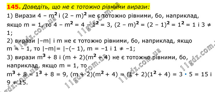Доведіть, що не є тотожно рівними вирази: 1) Вирази 4 – m2 і (2 – m)2 не є тотожно рівними, бо, наприклад, якщо m = 1, то 4 – m2 = 4 – 12 = 3, (2 – m)2 = (2 – 1)2 = 12 = 1 і 3 ≠ 1; 2) вирази |–m| і m не є тотожно рівними, бо, наприклад, якщо m = – 1, то |–m|= |–(– 1), m = –1 і 1 ≠ –1; 3) вирази m3 + 8 і (m + 2)(m2 + 4) не є тотожно рівними, бо, наприклад, якщо m = 1, то m3 + 8 = 13 + 8 = 9, (m + 2)(m2 + 4) = (1 + 2)(12 + 4) = 3 ∙ 5 = 15 і 9 ≠ 15.