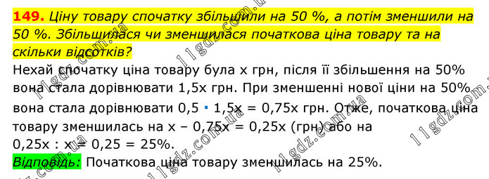 Ціну товару спочатку збільшили на 50 %, а потім зменшили на 50 %. Збільшилася чи зменшилася початкова ціна товару та на скільки відсотків? Нехай спочатку ціна товару була х грн, після її збільшення на 50% вона стала дорівнювати 1,5х грн. При зменшенні нової ціни на 50% вона стала дорівнювати 0,5 ∙ 1,5x = 0,75x грн. Отже, початкова ціна товару зменшилась на х – 0,75х = 0,25х (грн) або на 0,25х : х = 0,25 = 25%. Відповідь: Початкова ціна товару зменшилась на 25%.