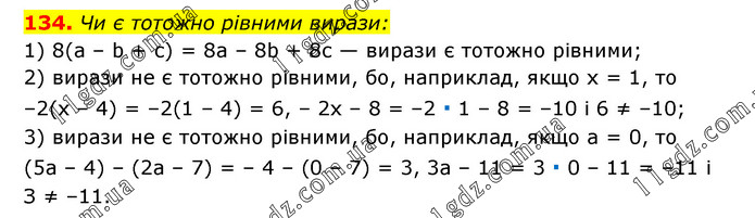 Чи є тотожно рівними вирази: 1) 8(а – b + с) = 8а – 8b + 8с — вирази є тотожно рівними; 2) вирази не є тотожно рівними, бо, наприклад, якщо х = 1, то –2(х – 4) = –2(1 – 4) = 6, – 2х – 8 = –2 · 1 – 8 = –10 і 6 ≠ –10; 3) вирази не є тотожно рівними, бо, наприклад, якщо а = 0, то (5а – 4) – (2а – 7) = – 4 – (0 – 7) = 3, 3а – 11 = 3 · 0 – 11 = –11 і З ≠ –11.