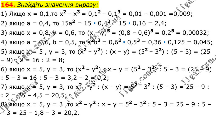 Знайдіть значення виразу: 1) Якщо х = 0,1,то x2 – х3 = 0,12 – 0,13 = 0,01 – 0,001 =0,009; 2) якщо а = 0,4, то 15a2 = 15 ∙ 0,42 = 15 ∙ 0,16 = 2,4; 3) якщо x = 0,8, y = 0,6, то (x – y)5 = (0,8 – 0,6)5 = 0,25 = 0,00032; 4) якщо а = 0,6, b = 0,5, то а2b3 = 0,62 ∙ 0,53 = 0,36 ∙ 0,125 = 0,045; 5) якщо х = 5 , y = 3, то (х2 – у2) : (х – у) = (52 – З2) : (5 – 3) = (25 – 9) : 2 = 16 : 2 = 8; 6) якщо х = 5, y = 3, то (х2 – у2) : х – у = (52 – З2) : 5 – 3 = (25 – 9) : 5 – 3 = 16 : 5 – З = 3,2 – 2 = 0,2; 7) якщо x = 5, y = 3, то x2 – y2 : (х – у) = 52 – З2 : (5 – 3) = 25 – 9 : : 2 = 25 – 4,5 = 20,5; 8) якщо x = 5, у = 3 ,то х2 – у2 : х – у = 52 – 32 : 5 – 3 = 25 – 9 : 5 – – 3 = 25 – 1,8 – 3 = 20,2.
