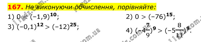 Не виконуючи обчислення, порівняйте: 1) 0 < (–1,9)10; 3) (–0,1)12 > (–12)25; 2) 0 > (–76)15; 4) (–47/9)9 > (–58/11)9.