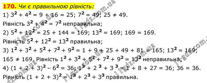 Чи є правильною рівність: 1) З2 + 42 = 9 + 16 = 25; 72 = 49; 25 ≠ 49. Рівність З2 + 42 = 72 неправильна; 2) 52 + 122 = 25 + 144 = 169; 132 = 169; 169 = 169. Рівність 52 + 122 = 132 правильна; 3) 12 + 32 + 52 + 72 + 92 = 1 + 9 + 25 + 49 + 81 = 165; 132 = 169; 165 ≠ 169. Рівність 12 + З2 + 52 + 72 + 92 = 132 неправильна; 4) (1 + 2 + З)2 – 62 = 36; 13 + 2 3 + З 3 = 1 + 8 + 27 = 36; 36 = 36. Рівність (1 + 2 + З)2 = 13 + 23 + З3 правильна.