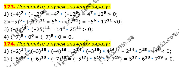 173. Порівняйте з нулем значення виразу: 1) (–4)7 ∙ (–12)9 = –47 ∙ (–129) = 47 ∙ 129 > 0; 2)(–5)6 ∙ (–17)11 = 56 ∙ (–1711) = –56 ∙ 1711 <0; 3) (–14)4 ∙ (–25)14 = 144 ∙ 2514 > 0; 4) (–7)9 ∙ 06 = (–7)9 ∙ 0 = 0. 174. Порівняйте з нулем значення виразу: 1) (–2)14 ∙ (–3)15 ∙ (–4)16 = 214 ∙ (–315) ∙ 416 = – 214 ∙ З15 ∙ 416 < 0; 2) (–5)17 ∙ (–6)18 ∙ (–7)19 = (–517) ∙ 618 ∙ (–719) = 517 ∙ 618 ∙ 719 > 0.