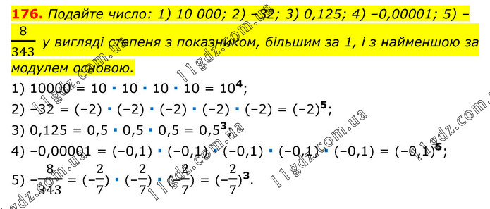 Подайте число: 1) 10 000; 2) –32; 3) 0,125; 4) –0,00001; 5) –8/343 у вигляді степеня з показником, більшим за 1, і з найменшою за модулем основою. 1) 10000 = 10 ∙ 10 ∙ 10 ∙ 10 = 104; 2) –32 = (–2) ∙ (–2) ∙ (–2) ∙ (–2) ∙ (–2) = (–2)5; 3) 0,125 = 0,5 ∙ 0,5 ∙ 0,5 = 0,53; 4) –0,00001 = (–0,1) ∙ (–0,1) ∙ (–0,1) ∙ (–0,1) ∙ (–0,1) = (–0,1)5; 5) –8/343 = (–2/7) ∙ (–2/7) ∙ (–2/7) = (–2/7)3.