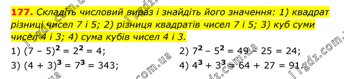Складіть числовий вираз і знайдіть його значення: 1) квадрат різниці чисел 7 і 5; 2) різниця квадратів чисел 7 і 5; 3) куб суми чисел 4 і 3; 4) сума кубів чисел 4 і 3. 1) (7 – 5)2 = 22 = 4; 3) (4 + 3)3 = 73 = 343; 2) 72 – 52 = 49 – 25 = 24; 4) 43 + З3 = 64 + 27 = 91.